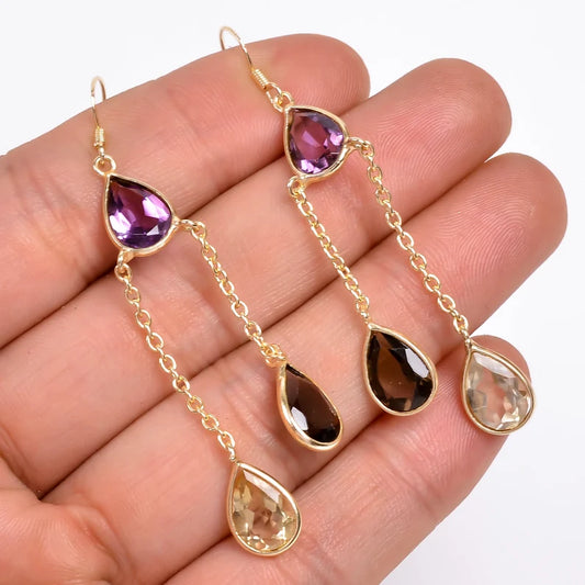 Amethyst, Smokey Quartz, Citrine Gemstone Drop Handcrafted Dangling Earrings